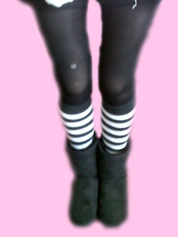 Here I've got some thick black tights on under a pair of small black shorts that the long white vest nearly covers, then over the tights I have some knee high black and white striped socks and a nice pair of black UGG boots, which keep me very warm.